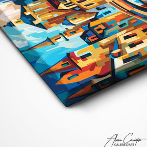 Our Cubism painting depicts a village and a bridge in a striking geometric style. The broken-down shapes and contrasting colors create a unique perspective that immediately catches the eye. Inspired by the masters of Cubism, this work brings a modern and intellectual artistic touch to your home. Perfect for a living room or gallery, this painting transforms your space into a true tribute to the artistic avant-garde.