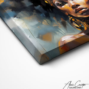 Our African woman canvas print combines modern design aesthetics with traditional African motifs. The distinctive colors and patterns make this canvas a striking addition to any space.