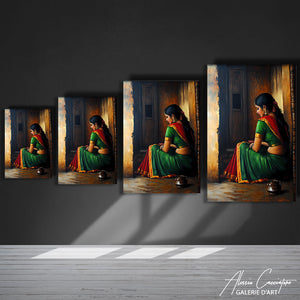Notre tableau femme indienne dégage une beauté silencieuse et méditative. Assise dans la lumière d’un intérieur ancien, la femme vêtue d’un sari vert et rouge incarne la tradition et la force tranquille. Ce tableau apporte une touche d’authenticité et de profondeur à votre décoration murale. Imprimé sur toile de qualité supérieure, il séduit par son réalisme et sa chaleur émotionnelle.