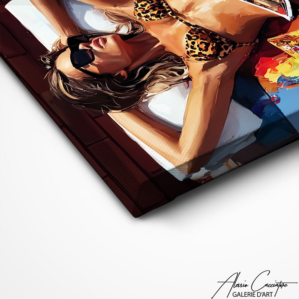 Our Reclining Woman painting depicts a blonde in a bikini relaxing on a deckchair, a magazine and fruit by her side. Bright and summery, it exudes vacation and glamour. An ideal decor to add freshness and elegance to your home.
