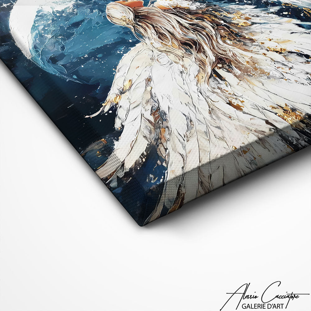 Notre tableau femme ange illustre une femme élégante vêtue d’une robe dorée, ailes déployées dans un univers cosmique. Chic et spirituelle, elle incarne force et beauté. Parfaite pour un salon raffiné.