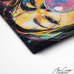 Our pop art female face painting depicts a luxurious young woman against a black background, holding a bubble of chewing gum. A stylish and eye-catching piece. Ideal for a bold, modern decor.