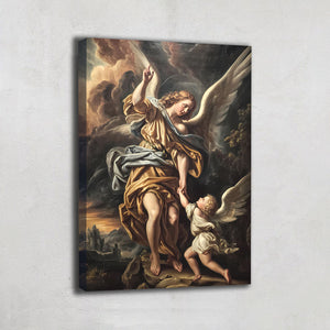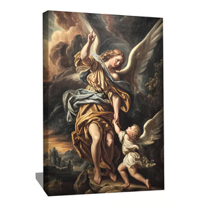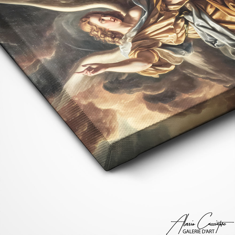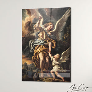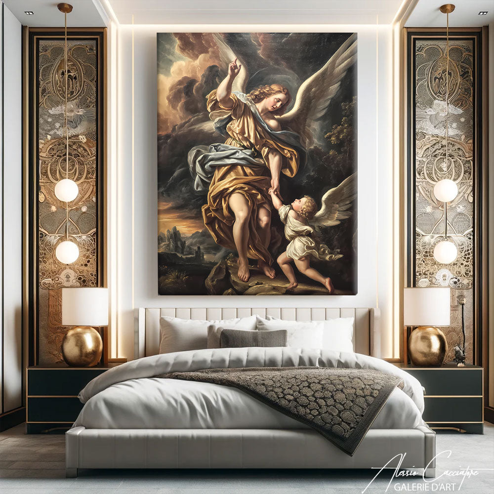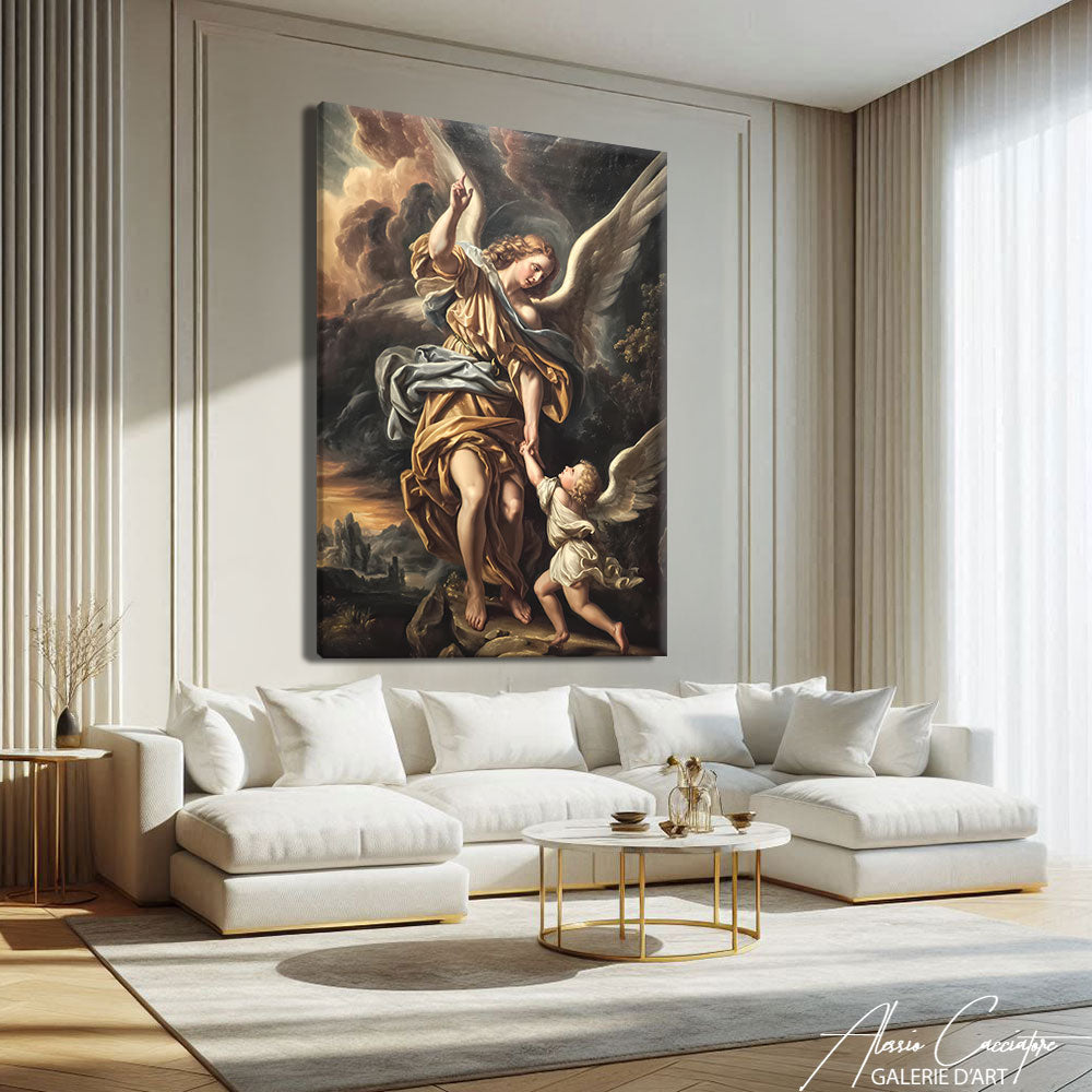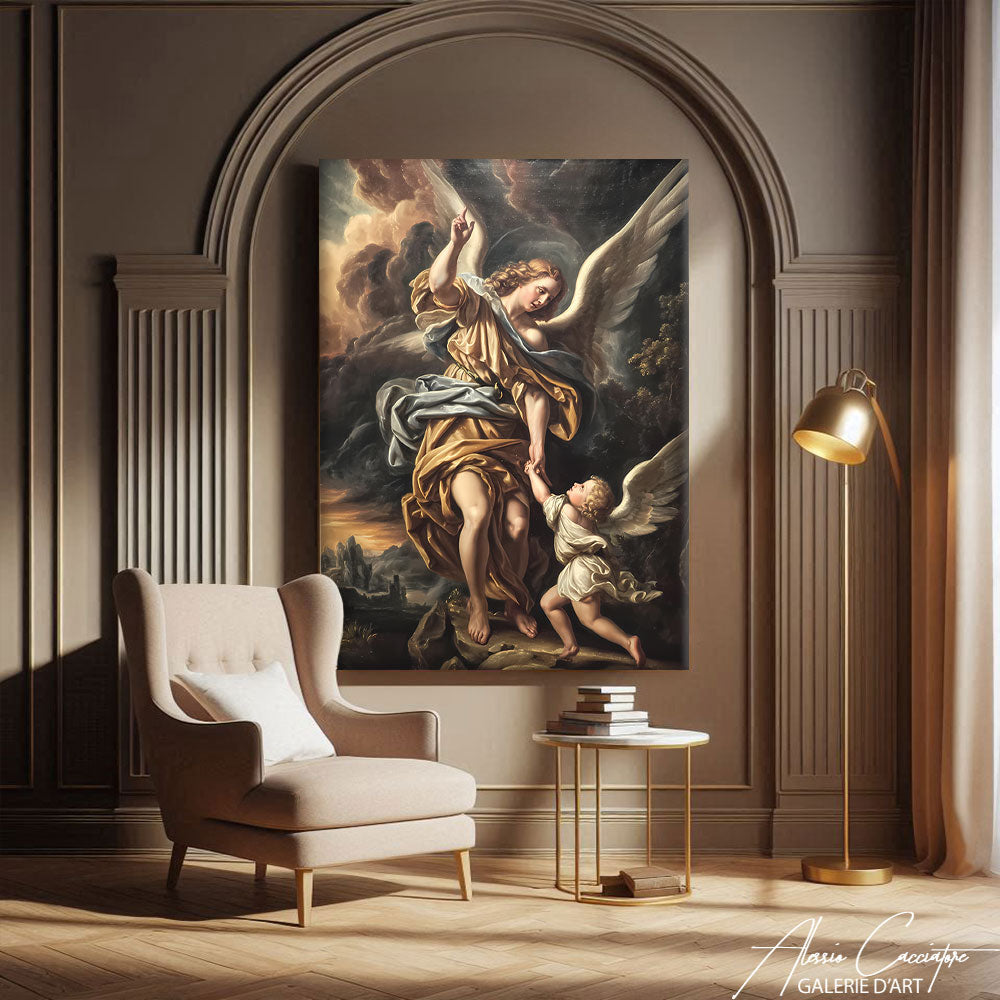 Notre tableau ange femme illustre une mère ange tenant la main de son enfant dans une scène baroque. Touchant et symbolique, il évoque amour et spiritualité. Idéal pour une décoration émotionnelle et élégante.
