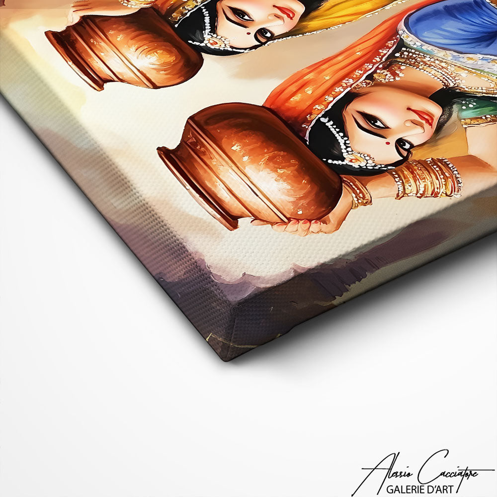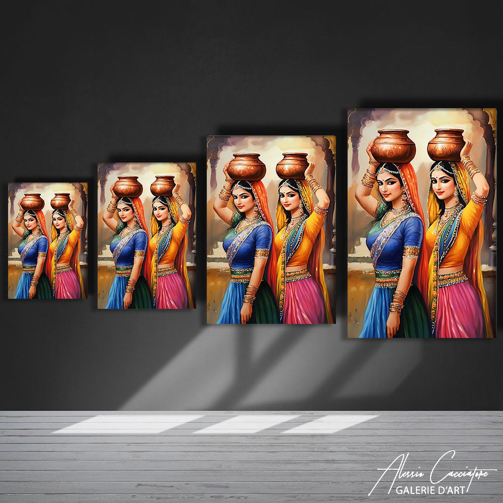 Notre tableau femme Inde célèbre la grâce et la féminité à travers deux femmes parées de vêtements traditionnels colorés. Leurs expressions à la fois fières et bienveillantes illustrent la richesse culturelle et spirituelle de l’Inde. Les détails des tissus, des bijoux et des teintes lumineuses en font une œuvre captivante, idéale pour une décoration ethnique élégante. Réalisée sur toile premium, cette création allie culture, couleur et raffinement.