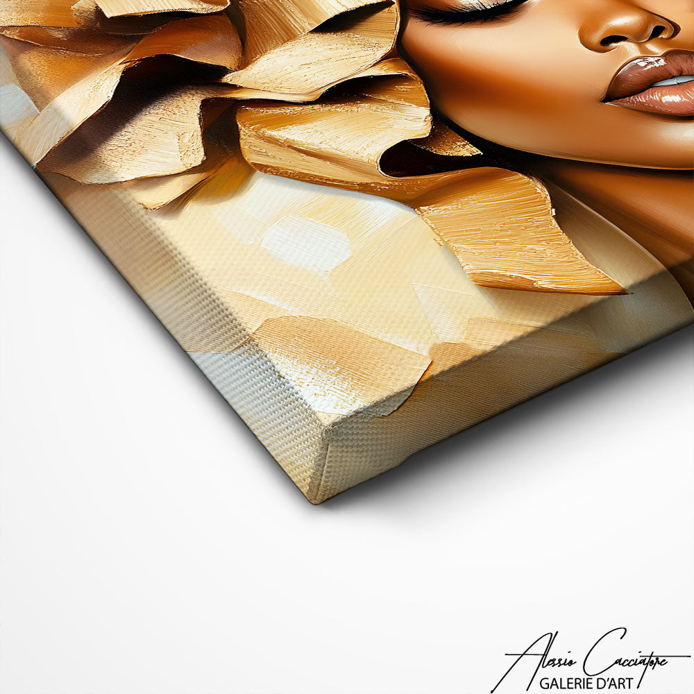 Our painting combines the power of black with the brilliance of gold to showcase an African woman in all her majesty. The visual effect is at once luxurious, modern, and symbolic. Perfect for a chic and contemporary interior, this painting is a real eye-catcher. It powerfully embodies beauty and cultural richness.