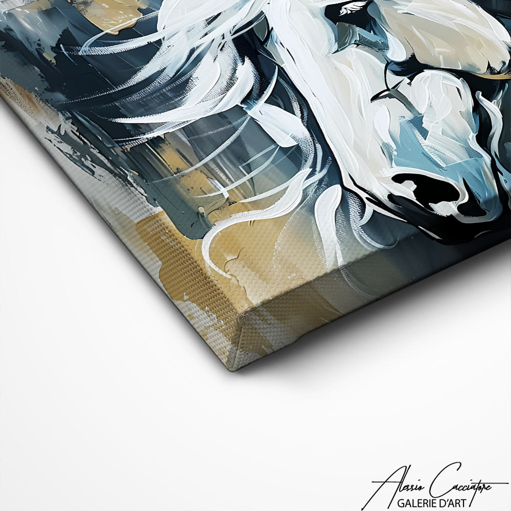 All the nobility and power of the Arabian horse are captured in our timelessly elegant work. Our painting highlights the natural grace of this legendary animal, a symbol of strength and prestige. Its sleek appearance and piercing gaze exude a captivating intensity, bringing a touch of character to your home. Thanks to its refined design and balanced composition, this piece fits equally well in classic and contemporary decor.