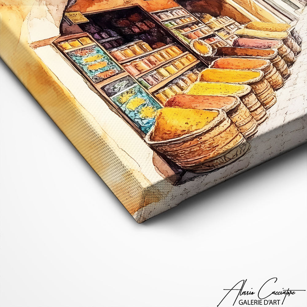 Notre tableau décoratif Maroc capture l’essence chaleureuse des ruelles marocaines et de leurs étals d’épices colorés. Les nuances de terre et d’or donnent une atmosphère authentique et solaire à la scène. Une œuvre qui invite au voyage et au dépaysement. Parfaite pour apporter charme et caractère à votre décoration intérieure.