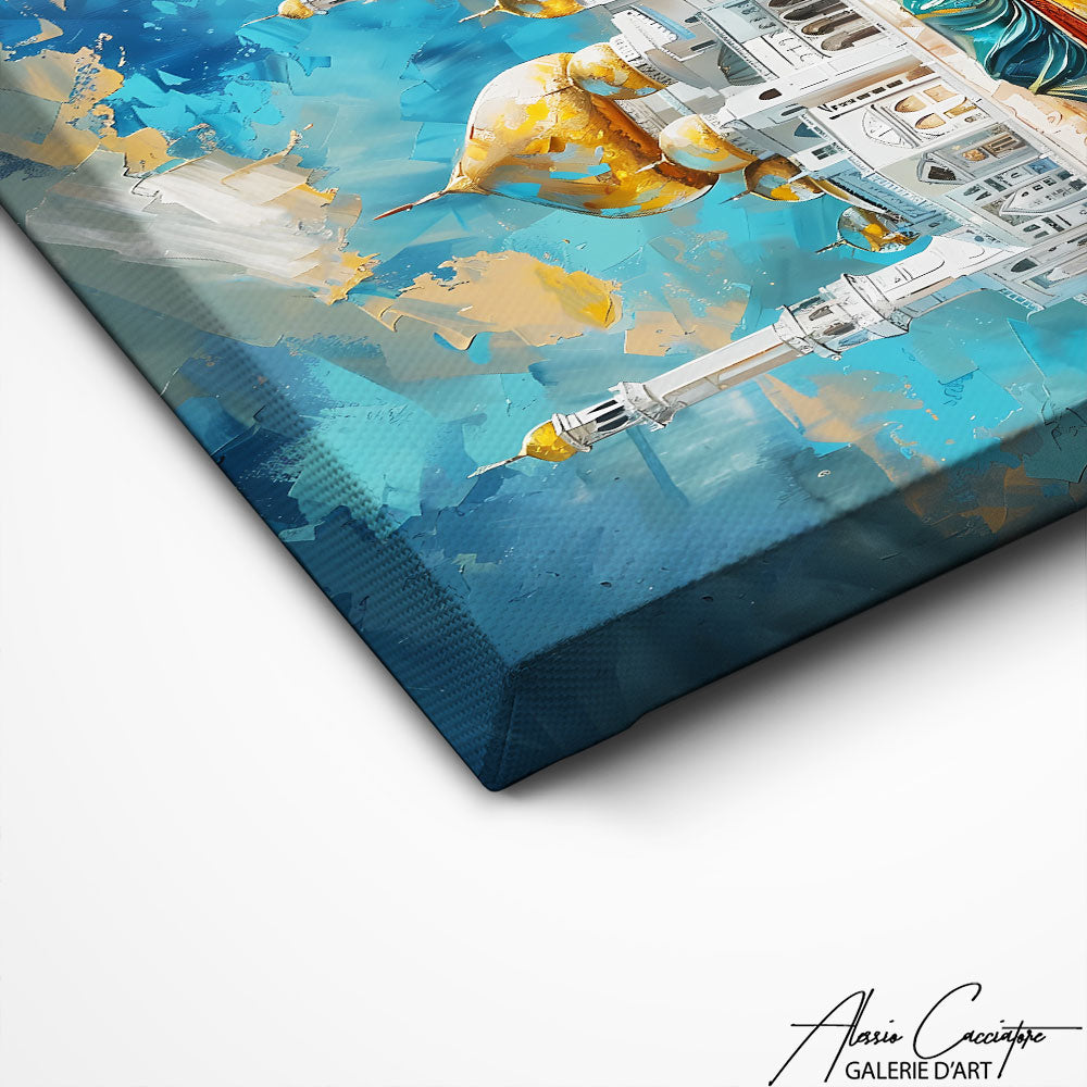 This mosque painting captures the architectural beauty of Islamic places of worship, with their majestic domes and minarets.