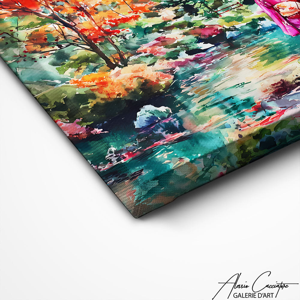 Our table Japanese watercolor is distinguished by its airy hues and poetic atmosphere. It brings a touch of freshness and lightness to your decor. An ideal work for a soft and soothing interior.