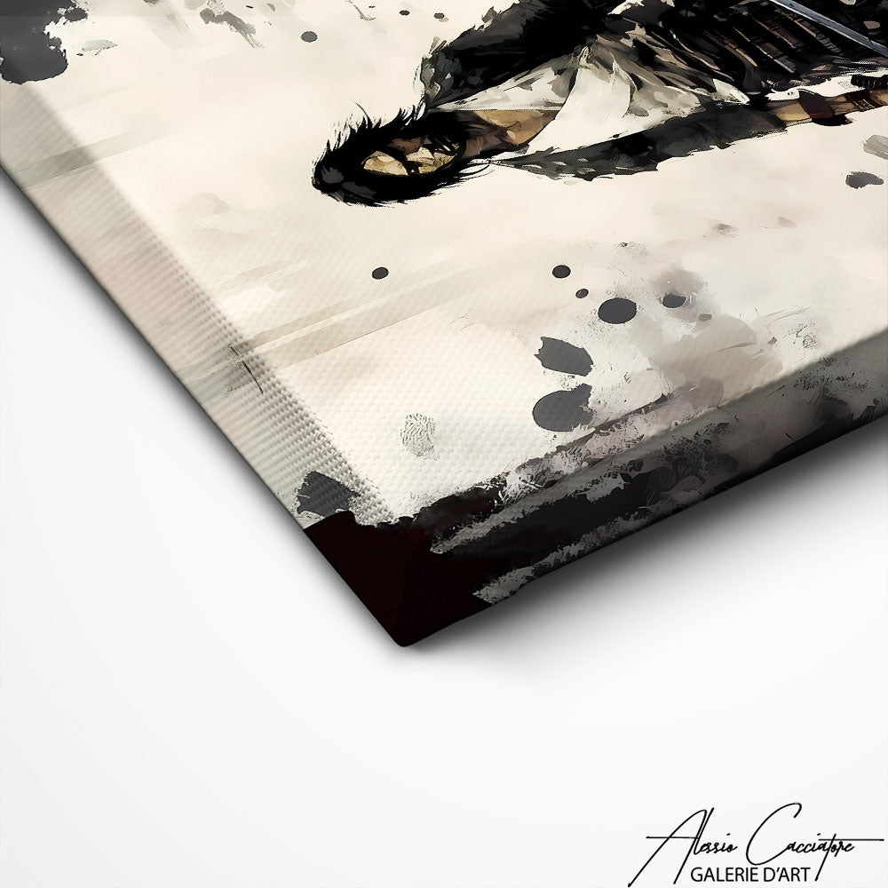 Our Japanese painting depicts a samurai in a combat or meditation posture, in a style that blends tradition with a refined aesthetic. The details of the armor and sword evoke the discipline and nobility of the warrior spirit. Perfect for a Zen and powerful decor. This painting embodies courage, serenity, and Japanese culture.