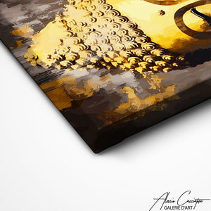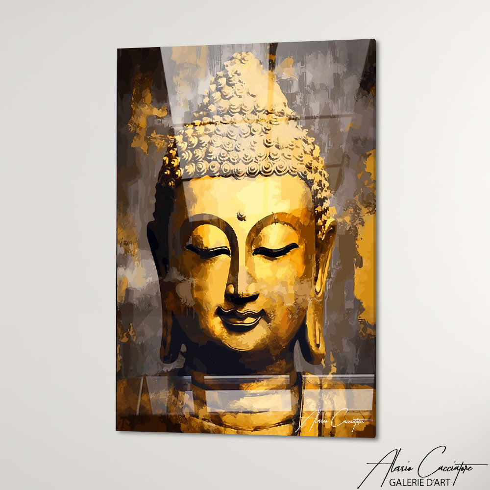 Our painting depicts a golden Buddha in an ancient style, evoking the serenity and spiritual depth of Asian traditions. The golden details add a sacred and luminous touch to the composition. Perfect for a Zen and timeless decor. This painting inspires inner peace and balance.
