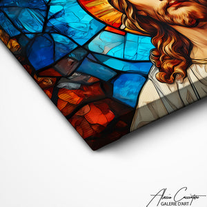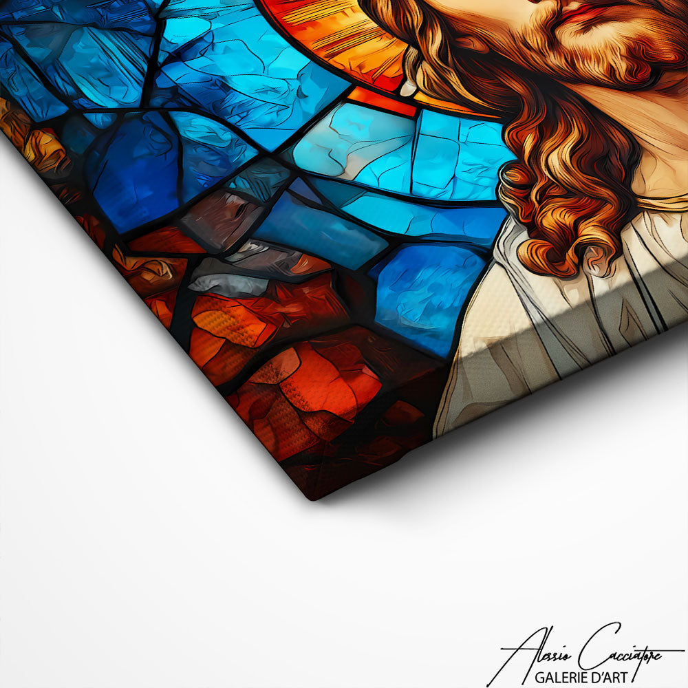 Our Christian canvas features a portrait of Jesus with blue stained glass! This spiritual work transforms your space into a modern, artistic chapel. The stained glass in the background brings divine light and sacred mystery. Christian art that uplifts the soul!