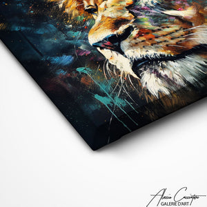 This lion portrait painting showcases the majesty and power of the king of the savannah through a captivating gaze and meticulous details. The lion's face, imbued with nobility and wisdom, is magnificently depicted, making this work a centerpiece that brings character and grandeur to your interior. Ideal for a refined decor, it symbolizes strength and dignity.