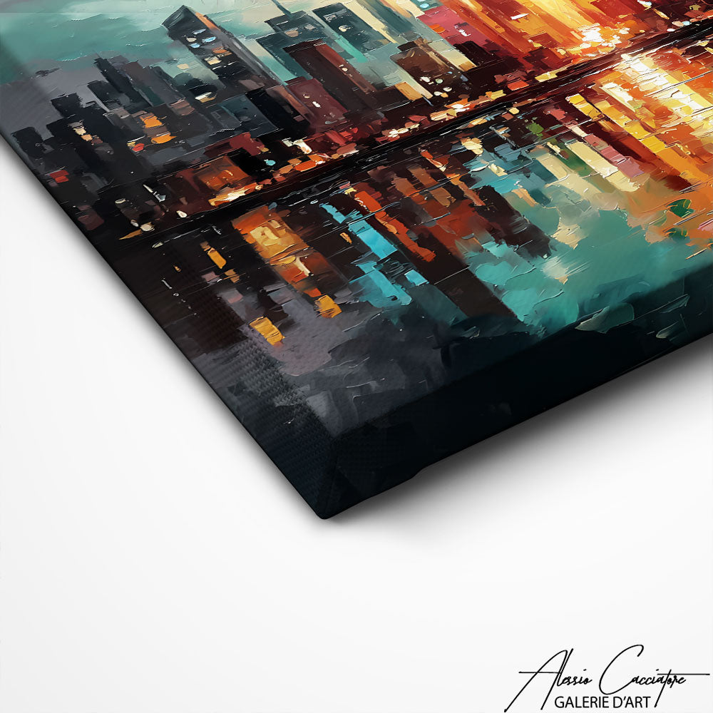 Our abstract color painting features a striking, colorful skyline! This urban artwork transforms your wall into a dynamic modern art gallery. The vibrant colors bring energy and modernity to your decor. Abstract art that brightens your home!