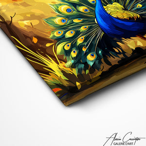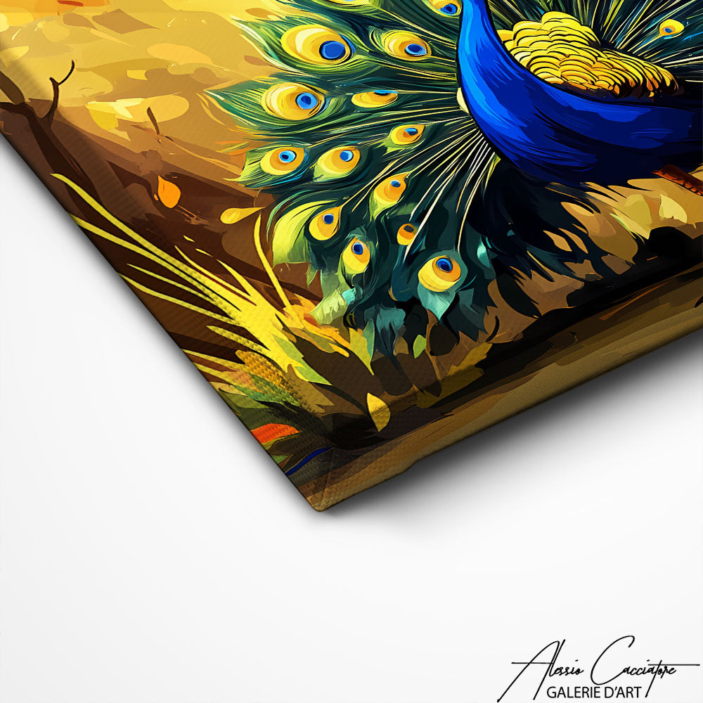 Our peacock painting combines natural elegance with visual richness. Perfect for a sophisticated interior, it creates an atmosphere of refinement and distinction. The shimmering hues and majestic grace of this iconic bird captivate the eye and evoke eternal beauty. Our work becomes a decorative element that instantly elevates your space with its regal presence and symbolism of renewal and immortality.