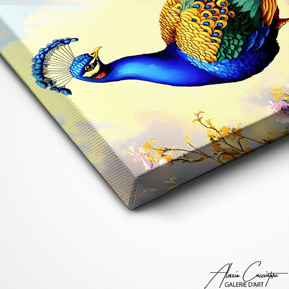Our striking peacock blue painting showcases the blue peacock in all its chromatic majesty. Our painting perfectly captures the distinctive azure hues of this magnificent bird, from deep blues to turquoise and cobalt shades that define its spectacular plumage. The artist has successfully captured the visual intensity of this iconic creature, with its fanned tail and hypnotic eyespots.