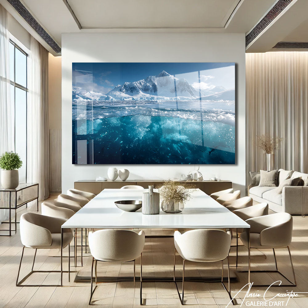 Our plexiglass photo print features a landscape that's half aquatic, half mountainous! This dual-pane plexiglass artwork creates a striking visual effect. High-definition photography on plexiglass reveals this modern arctic vision. Contemporary photographic art at its finest!