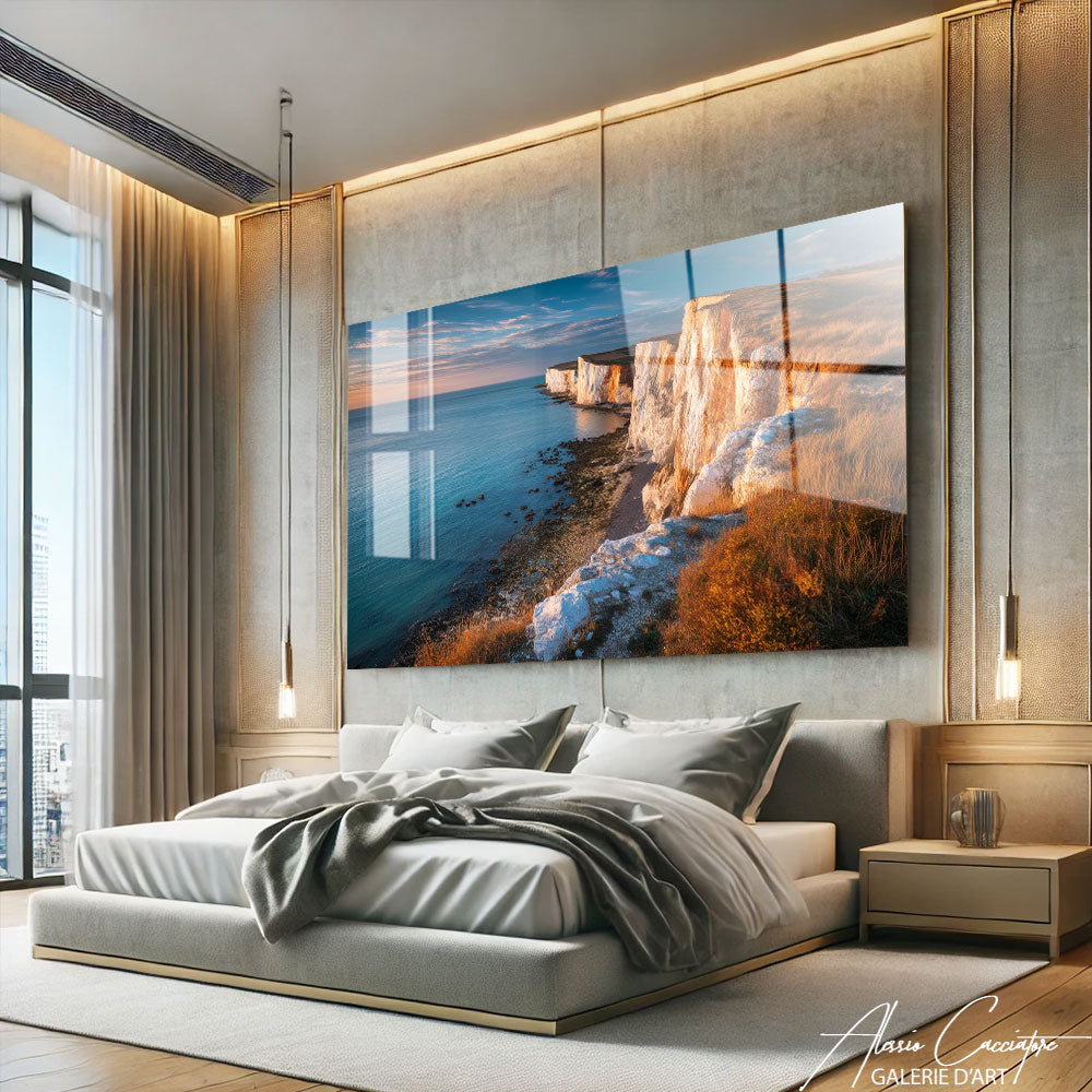 Our plexiglass seascape painting reveals the majestic cliffs of Étretat! This Normandy artwork on plexiglass brings a fresh maritime feel to your decor. The brilliance of the plexiglass enhances these iconic French cliffs. Modern coastal art that transports you to Normandy!