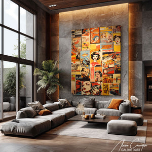 It is an intriguing fusion of contemporary design and urban art. The graphic elements, combined with a bold color palette, give this work an avant-garde look that is sure to catch everyone's eye.