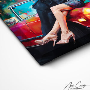 Notre tableau tendance illustre un couple chic et élégant s’embrassant sur une voiture de sport rétro. Romantique et glamour, elle évoque luxe et passion. Parfaite pour un intérieur raffiné et moderne.