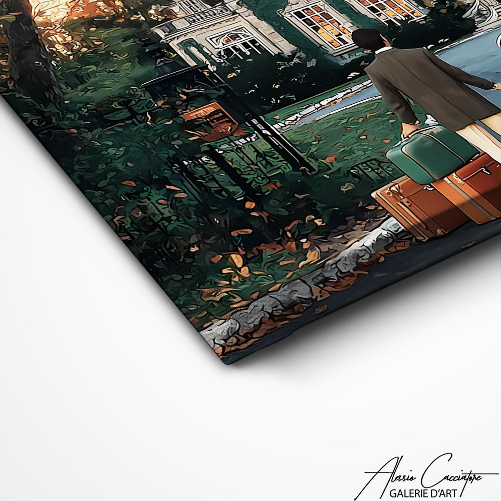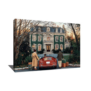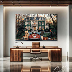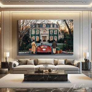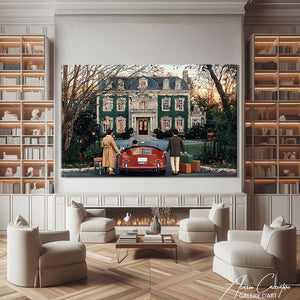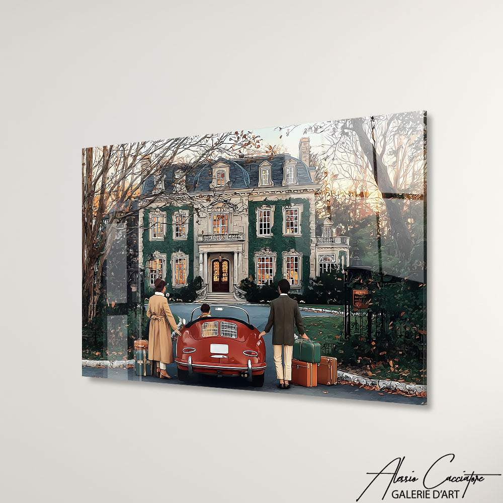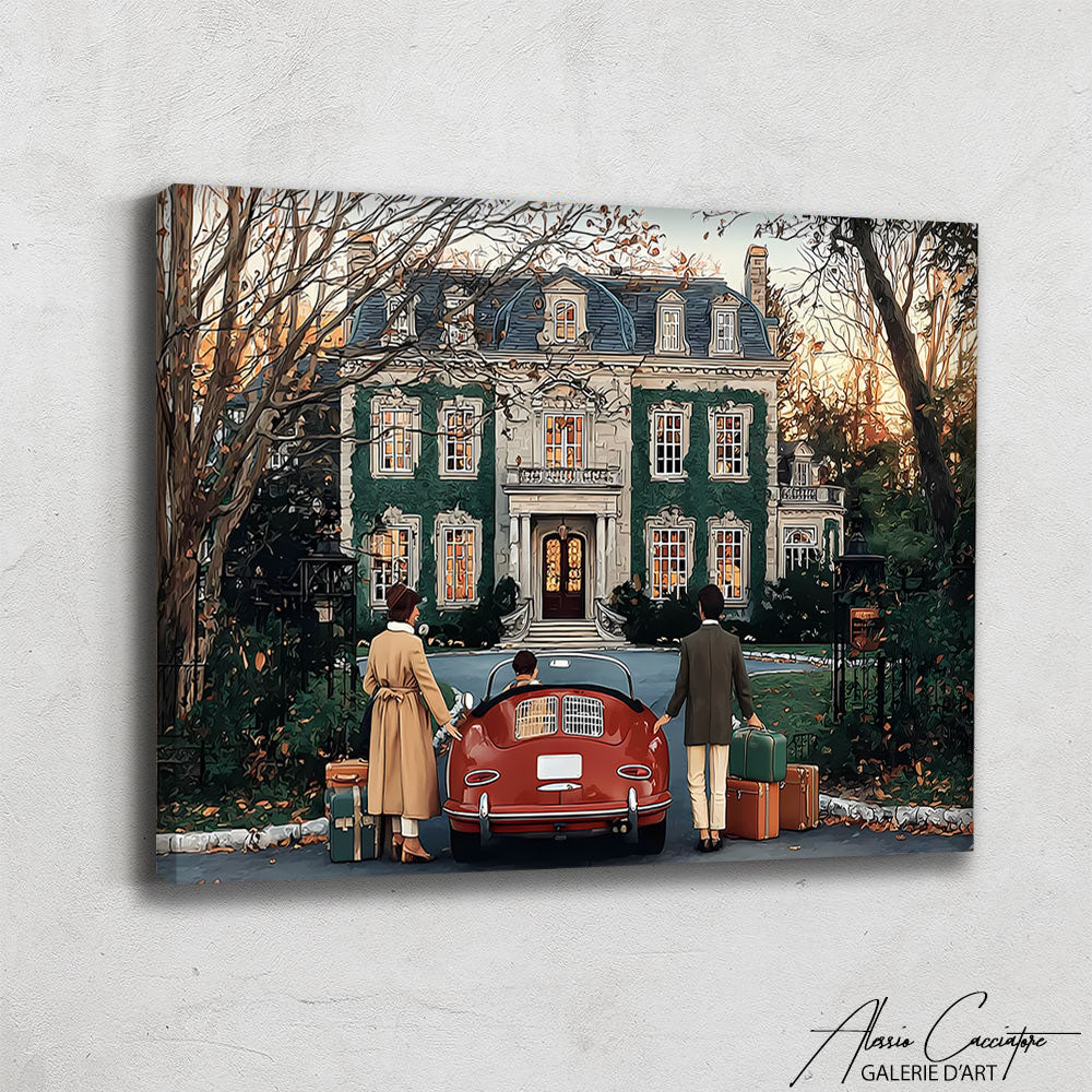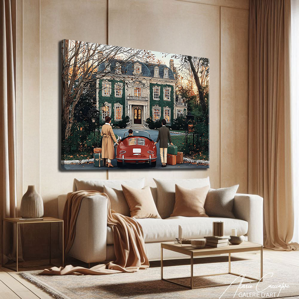 Our chic and modern print features a family in front of a refined mansion, accompanied by a vintage sports car. Elegant and timeless, it exudes charm and exclusivity. Perfect for a high-end interior.