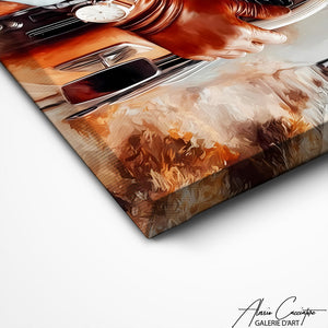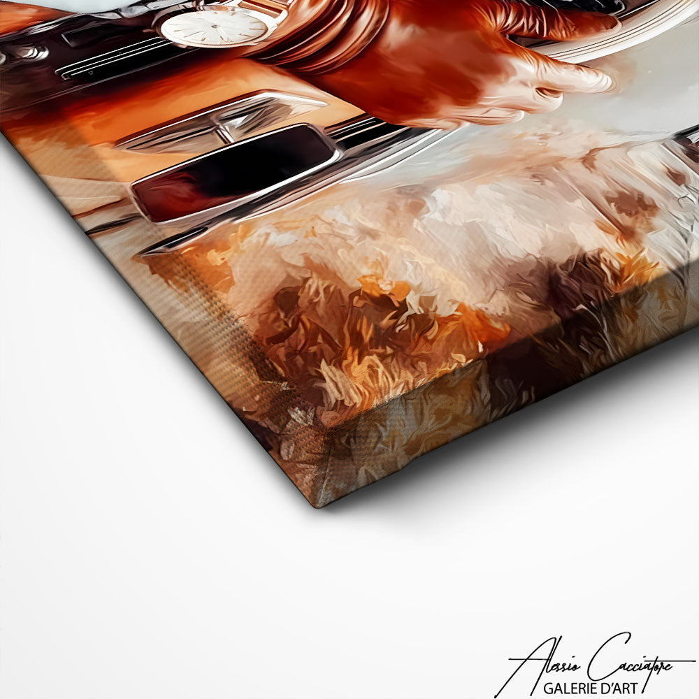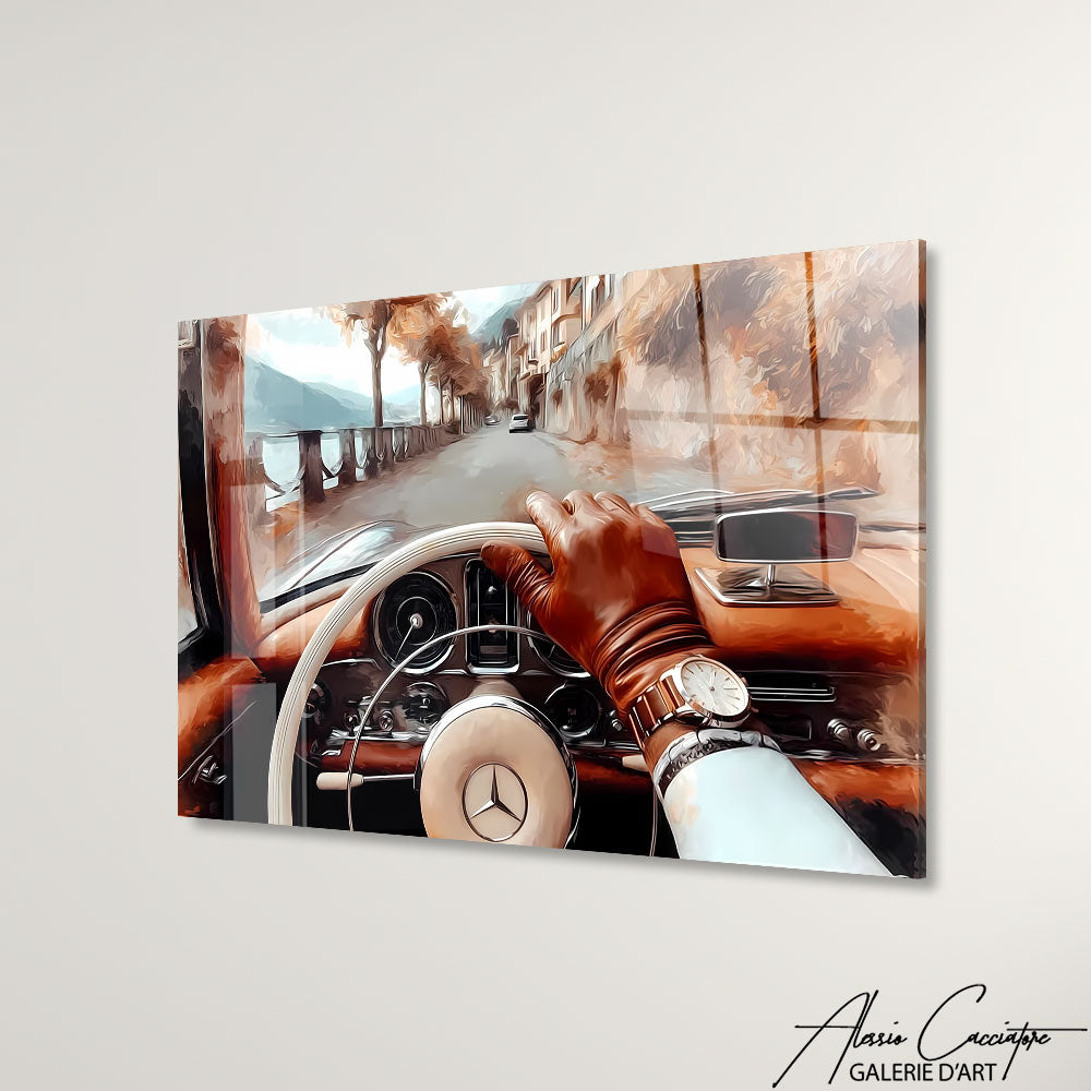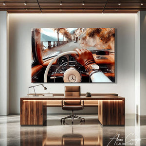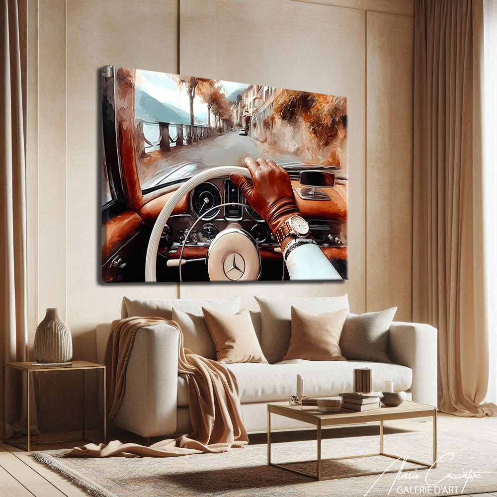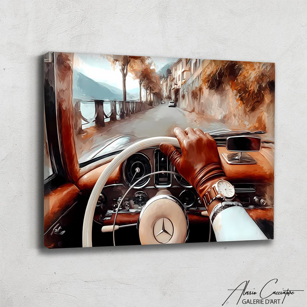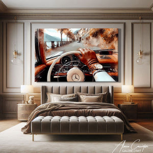 Our chic retro print depicts the interior of a luxury car complete with a watch and gloves. Elegant and refined, it evokes the world of automotive prestige. A perfect choice for a sophisticated and modern decor.
