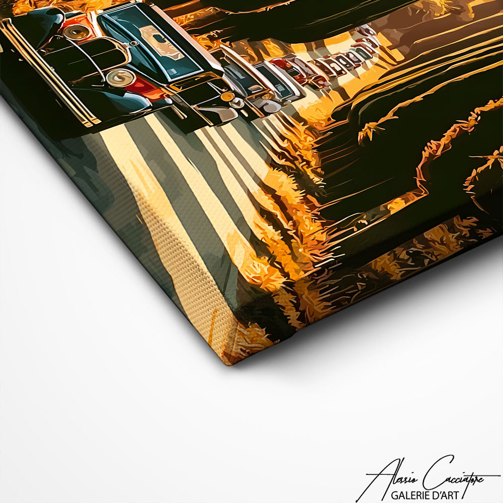 Notre tableau tendance chambre met en avant des voitures vintage rétro de luxe entourées d’une colonne de cyprès. Élégant et poétique, il dégage une atmosphère intemporelle. Un choix parfait pour donner cachet et élégance à vos murs.