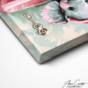 Our touching painting depicts a baby elephant taking a bath in a gentle and playful atmosphere. The light tones and playful details bring a touch of tenderness and freshness to your room. Perfect for a family or decorative bathroom, this painting transforms your space into a soothing and charming place.