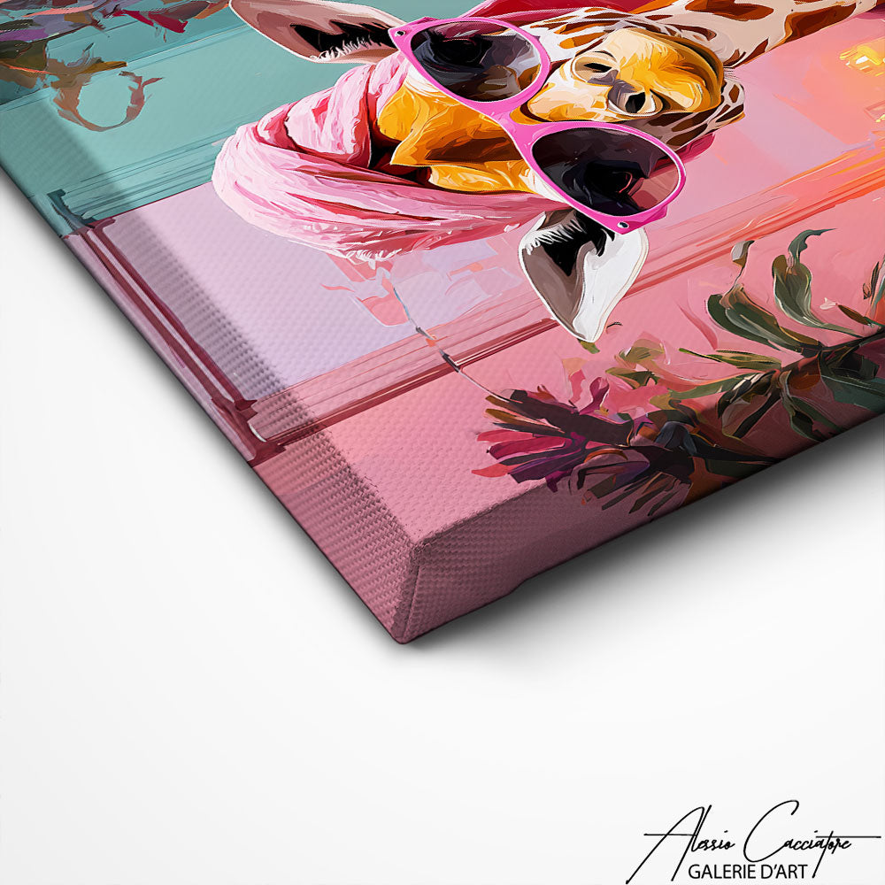Notre tableau salle de bain girafe met en avant une girafe élégante profitant d’un bain entouré de bougies et de fleurs. Un mélange parfait entre humour, détente et raffinement.