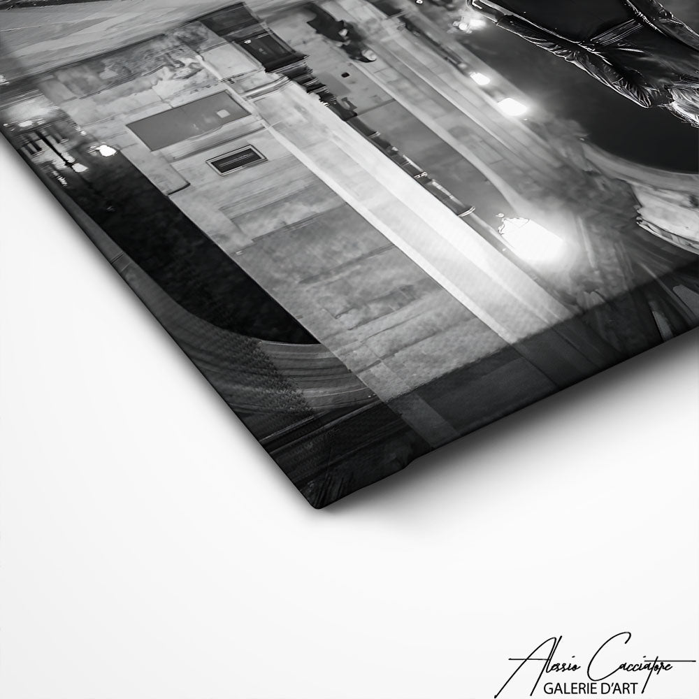 Our black and white living room painting depicts an elegant woman from behind walking through the streets of Paris at night. A refined and mysterious scene that brings chic and romanticism to your walls. Ideal for a sophisticated living room or bedroom.