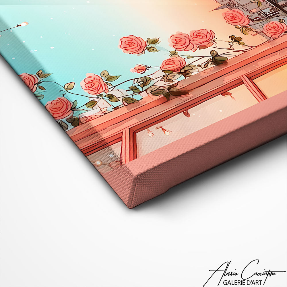 Our square living room painting features a pink view of the Eiffel Tower from a balcony adorned with roses. Poetic and romantic, it evokes Parisian charm. A perfect piece for an elegant and refined living room.