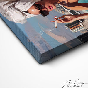 Our chic living room painting depicts a refined woman at the beach, cigarette and magazine in hand, towel and turban on her head. Elegant and modern, it exudes charm and originality. Perfect for a stylish decor.