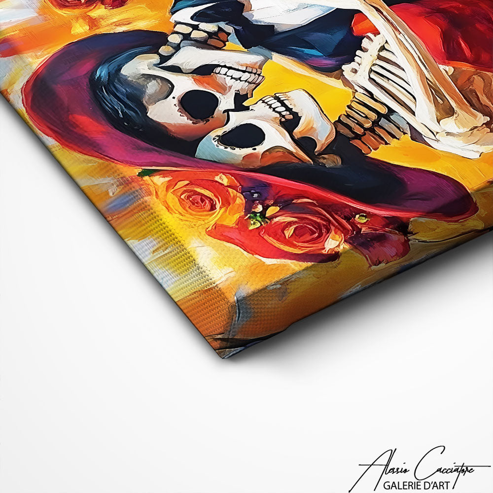 Notre tableau pop art tête de mort fusionne tradition mexicaine et esprit contemporain. Les squelettes dansants, entourés de roses et de couleurs intenses, symbolisent l’amour et la vie au-delà du temps. Idéal pour une décoration originale et pleine d’énergie, il attire immédiatement le regard.