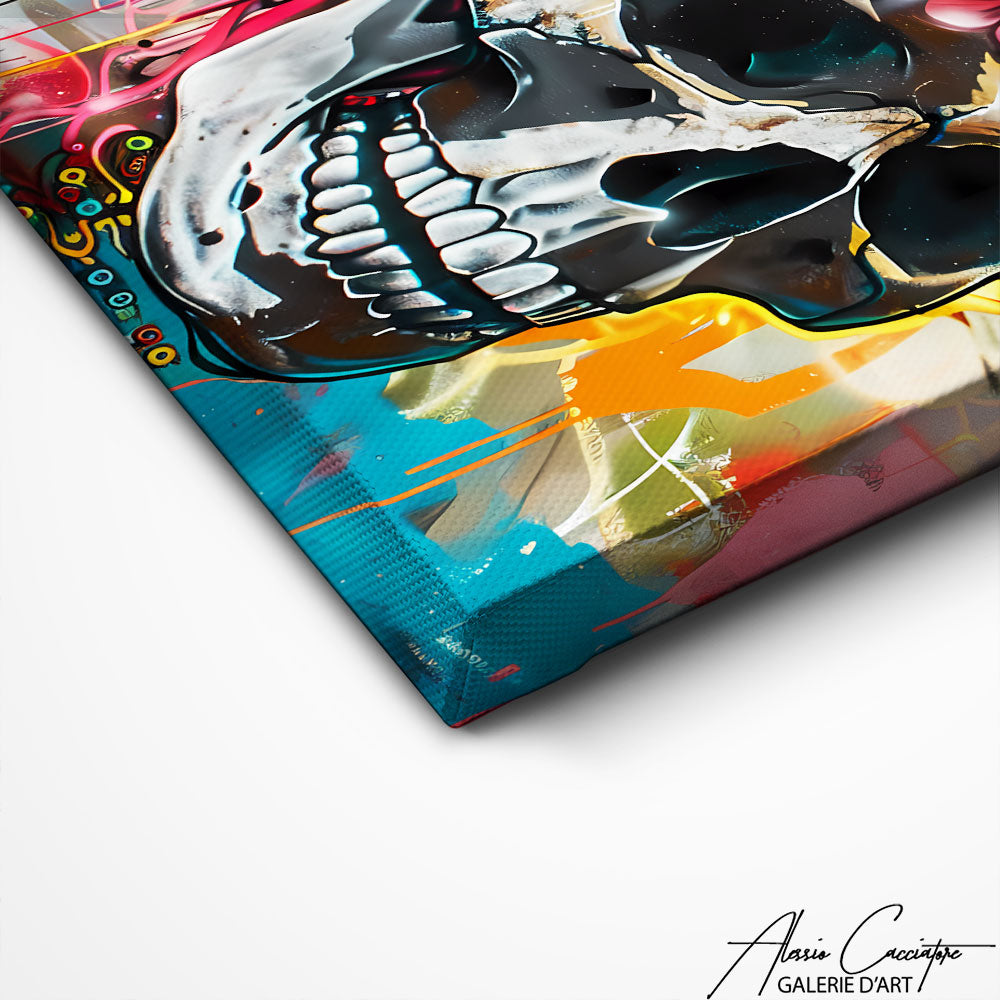 Our pop art skull painting combines a stylized skull with a floral crown.