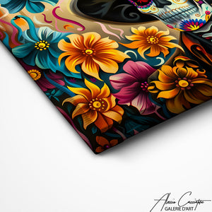 This Mexican skull center painting offers a classic or modern artistic vision, depending on the interpretation. Perfect for those looking for a symbolic and characterful work in their interior.