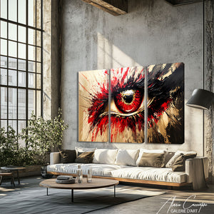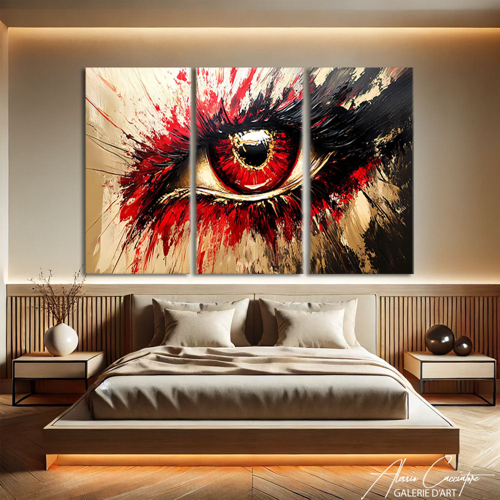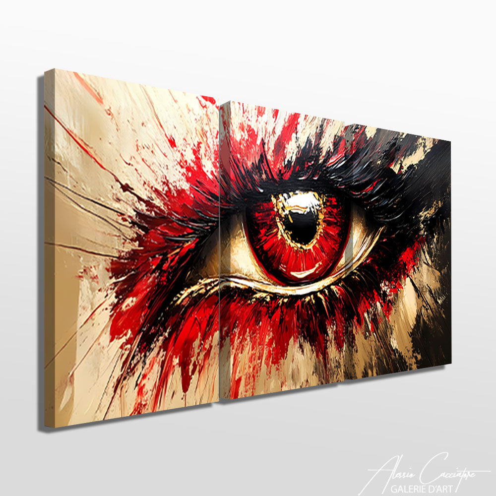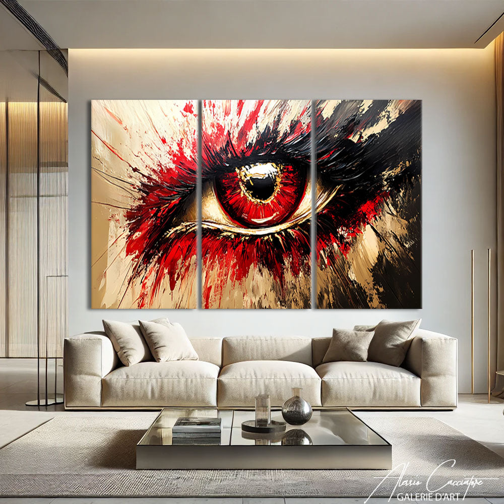 Our abstract triptych painting reveals an eye seen up close, intensely detailing its iris. A captivating work that commands attention. The perfect choice to add depth to your walls with this artistic piece that fascinates with its abstract realism.