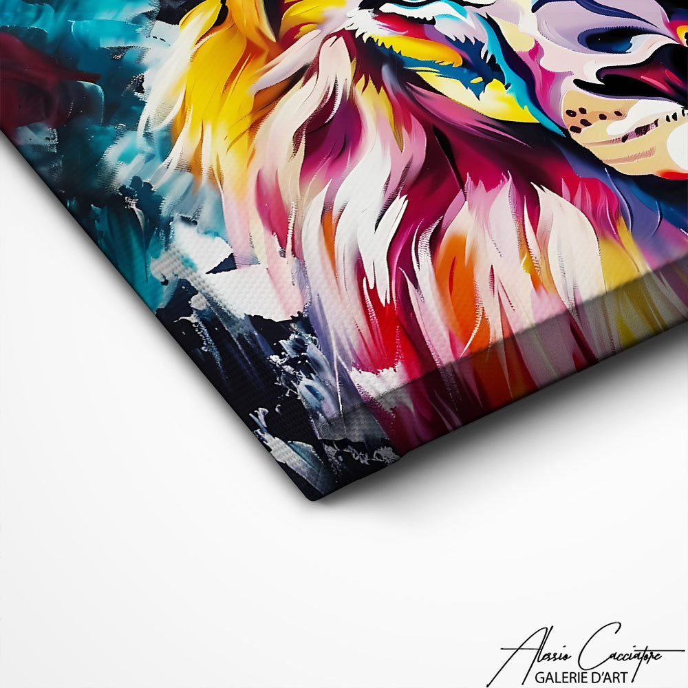 Notre tableau triptyque lion représente un lion moderne, structurée par des couleurs vives et des reflets lumineux. Les trois panneaux créent une perspective profonde qui allonge visuellement l’espace. Les contrastes de couleurs donnent du rythme et une vraie présence murale.