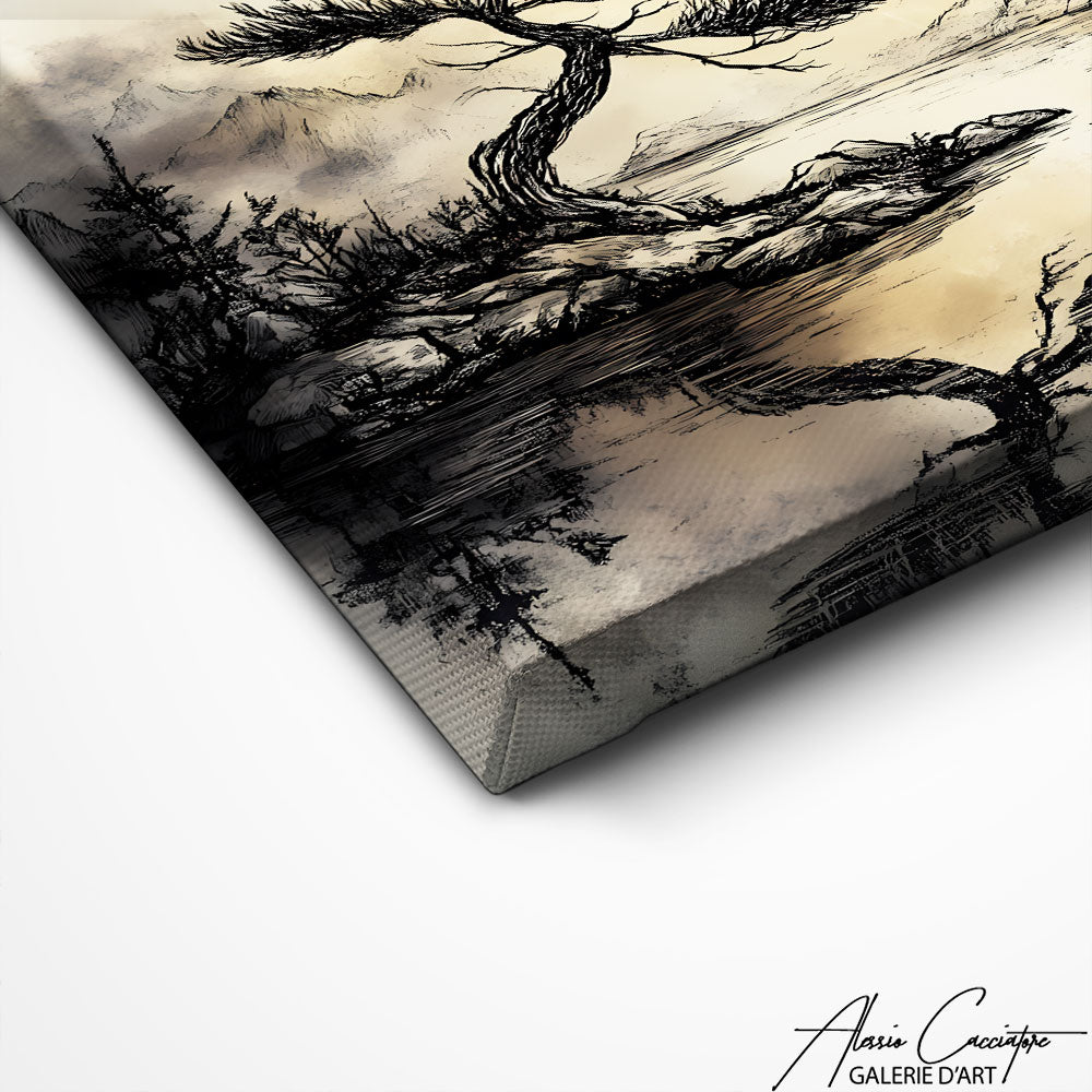 Un arbre solitaire se dresse au bord d’une étendue d’eau parfaitement calme. Son reflet se dessine dans la surface, accompagné de montagnes lointaines aux lignes douces. La scène repose sur une palette sobre de noirs, gris et tons clairs. L’ensemble transmet une sensation de silence et de profondeur visuelle.