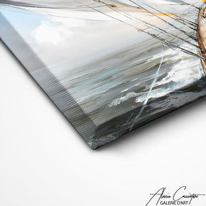 Notre tableau bateau illustre un voilier glissant sur les flots dans une lumière dorée. Raffiné et apaisant, il symbolise aventure et élégance. Une pièce idéale pour apporter prestige et calme à votre intérieur.