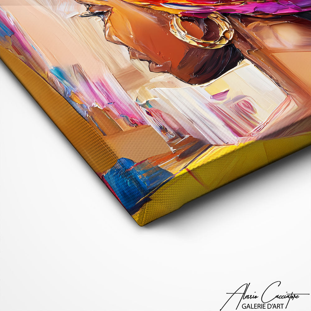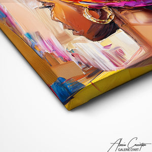 Our decorative African painting depicts an African woman seen from behind wearing a colorful turban in an abstract style. A refined and modern piece that will enhance your walls. Perfect for adding elegance and authenticity.