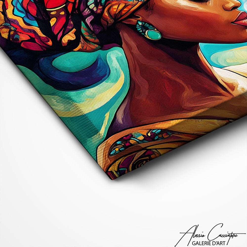 Our painting celebrates African elegance and cultural richness through traditional motifs and a contemporary aesthetic. Warm hues and stylized shapes give this work a warm and authentic aura. Perfect for a living room or entryway, this painting brings a strong identity to your decor. It invites travel and discovery with every glance.