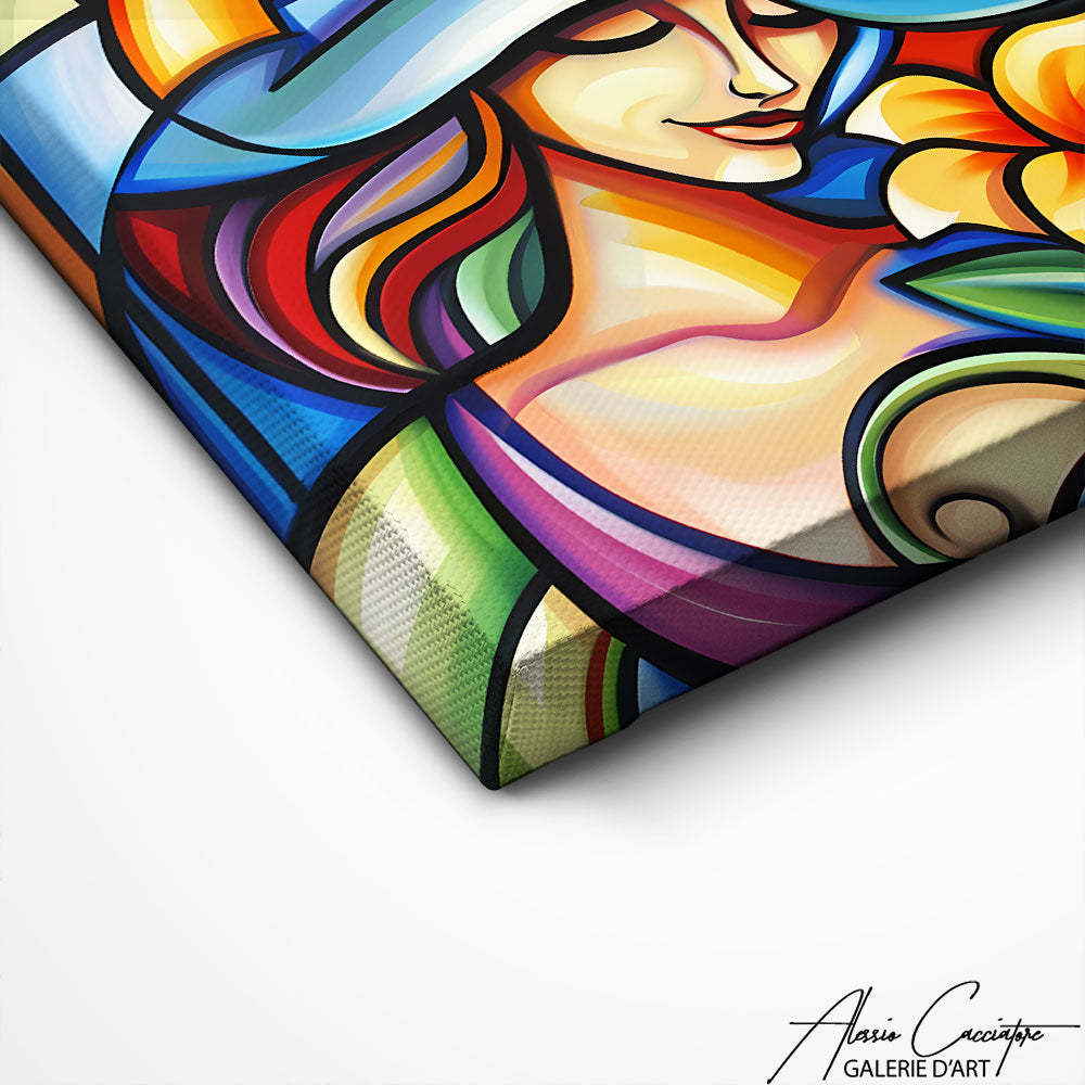 Our cubic painting depicts an elegant woman wearing a hat, enhanced by geometric shapes and contrasting colors. Inspired by the Cubist movement, the work deconstructs lines and volumes to create a modern and intriguing composition. Ideal for a contemporary interior, it brings a bold and sophisticated artistic touch, perfect for a living room, office, or gallery.
