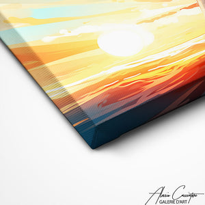 The sunset boat painting is a true ode to the ephemeral beauty of the marine twilight. Capturing a boat sailing under a sky ablaze with the orange hues of the setting sun, this work creates an atmosphere of tranquility and reverie.