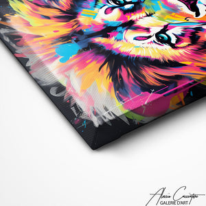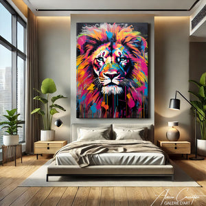 In this pop art lion painting, the iconic predator is depicted with bright hues and sharp contrasts. A perfect work to freshen up your interior while adding an artistic and fun touch.