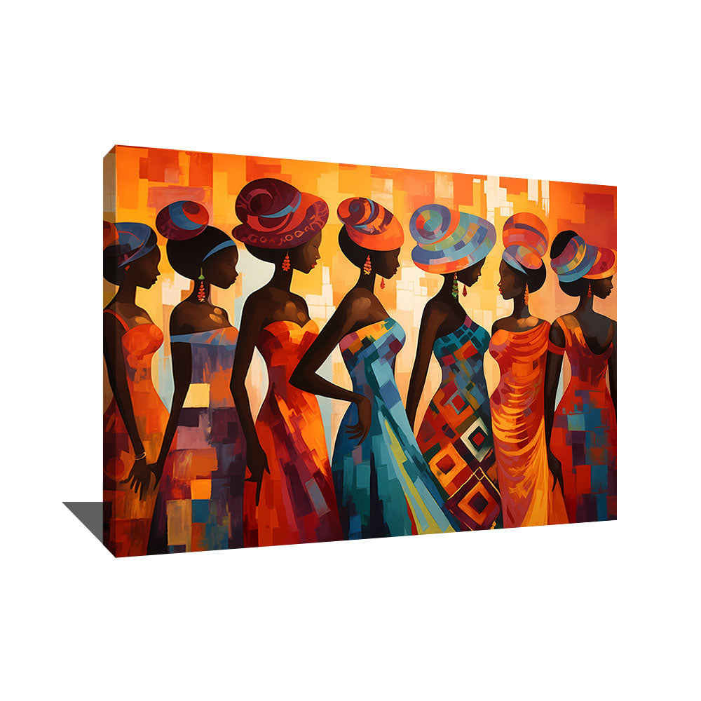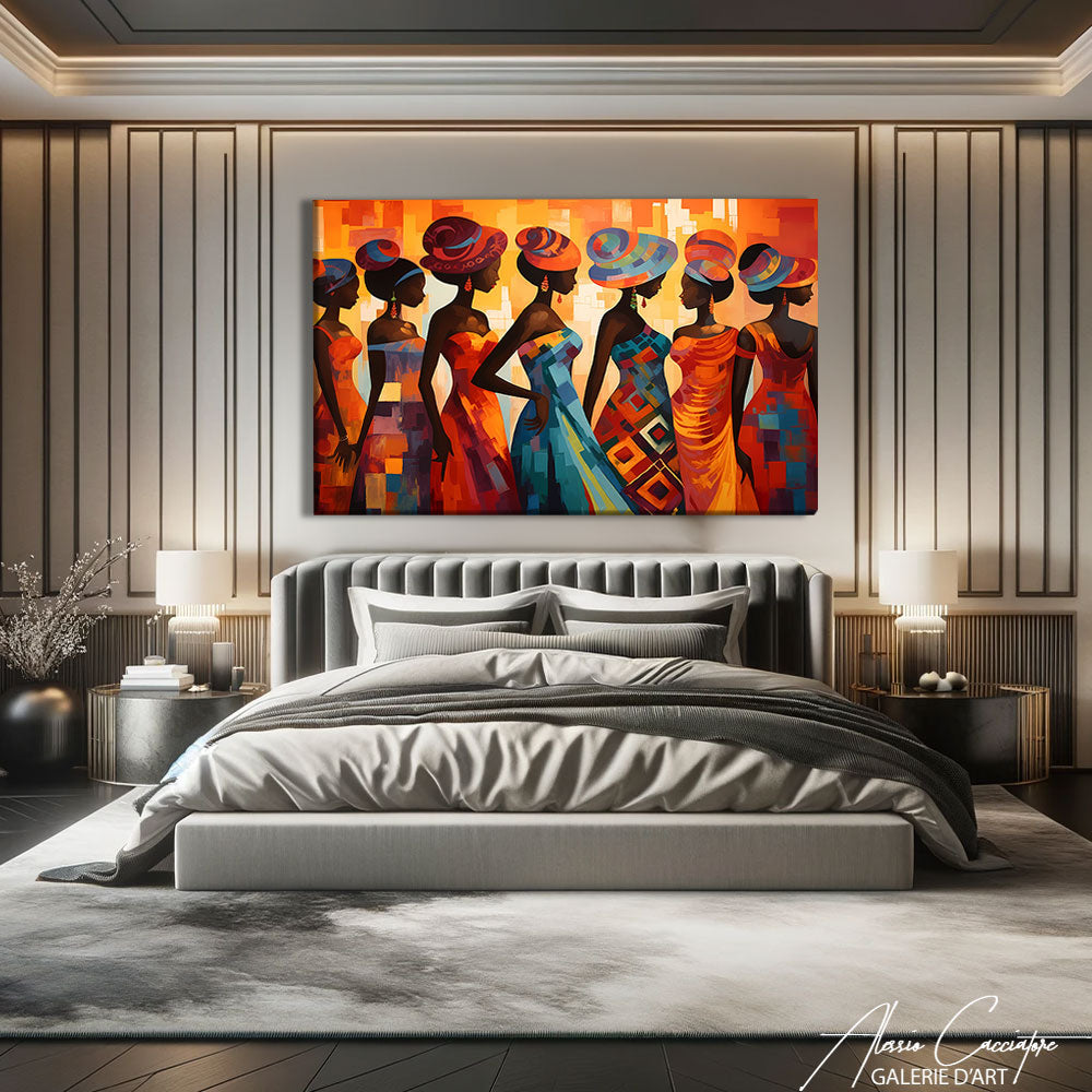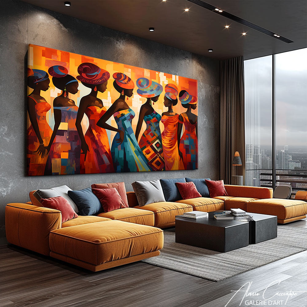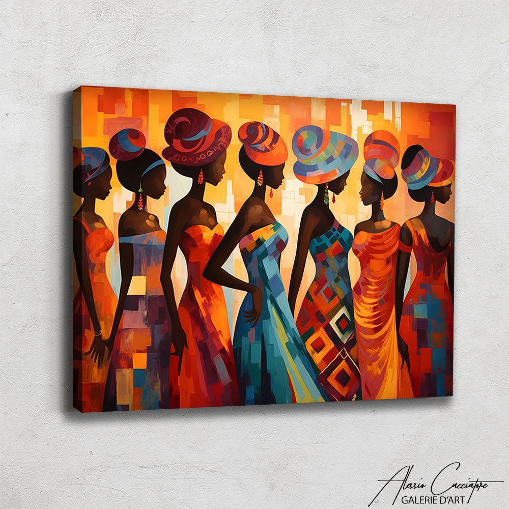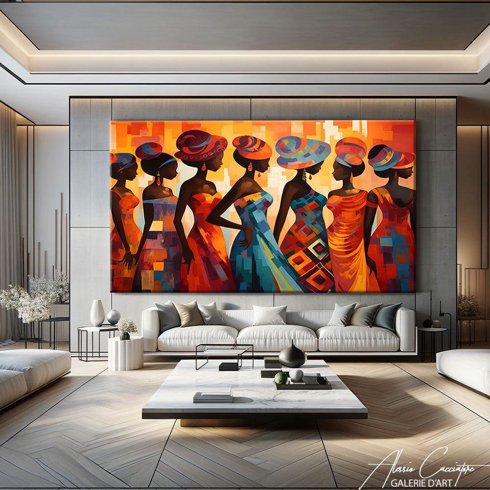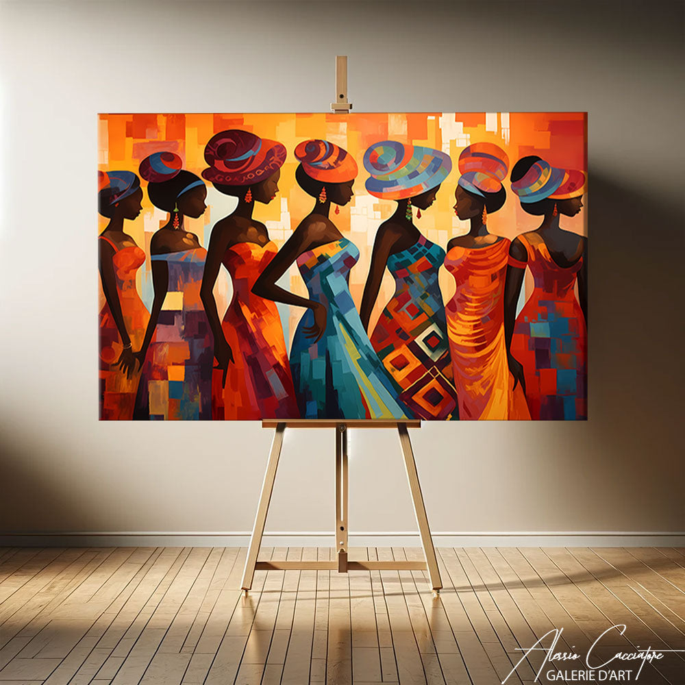 This painting is a vibrant homage to Africa with the representation of a group of women, it is a choice piece for those who wish to capture the wild spirit and natural beauty of this land.