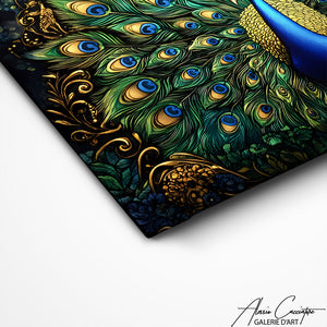 Our peacock painting brings depth and sophistication to your decor. Ideal for a contemporary living room, it creates a luxurious and soothing atmosphere. This iconic green color, somewhere between emerald and turquoise, evokes the natural beauty and timeless elegance of this majestic bird's plumage. Our painting becomes a decorative piece that enriches your interior color palette while adding a touch of natural mystique.