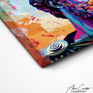 Our painting revisits a Greek god in a bold pop art style, blending ancient tradition with contemporary aesthetics. The vivid colors and powerful contrasts transform this mythological face into a modern and striking icon. Perfect for a unique decor, blending classical culture and urban art. This painting imposes a strong and unexpected presence, at the intersection of the sacred and design.