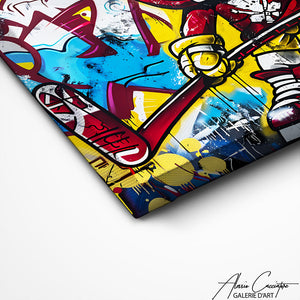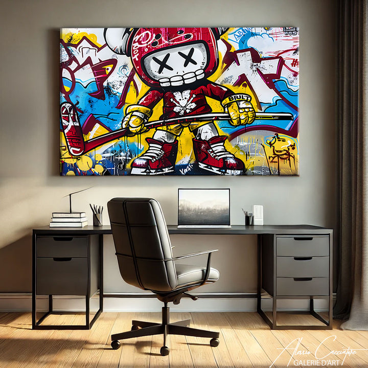 Our street art painting depicts a cartoon character transformed into a hockey player, in a bold and colorful urban style. The character's offbeat attitude and graffiti effects bring a real visual dynamism. Ideal for a fun, sporty, and resolutely modern decor. This painting blends pop culture and street style with originality.