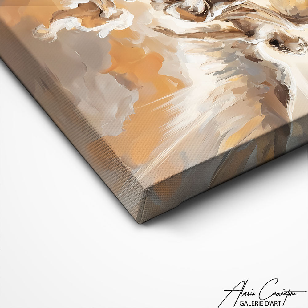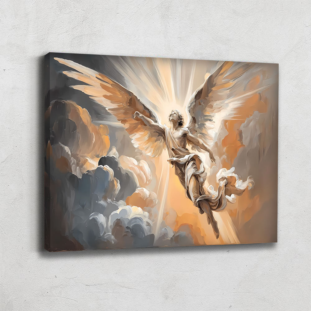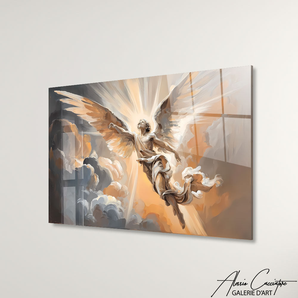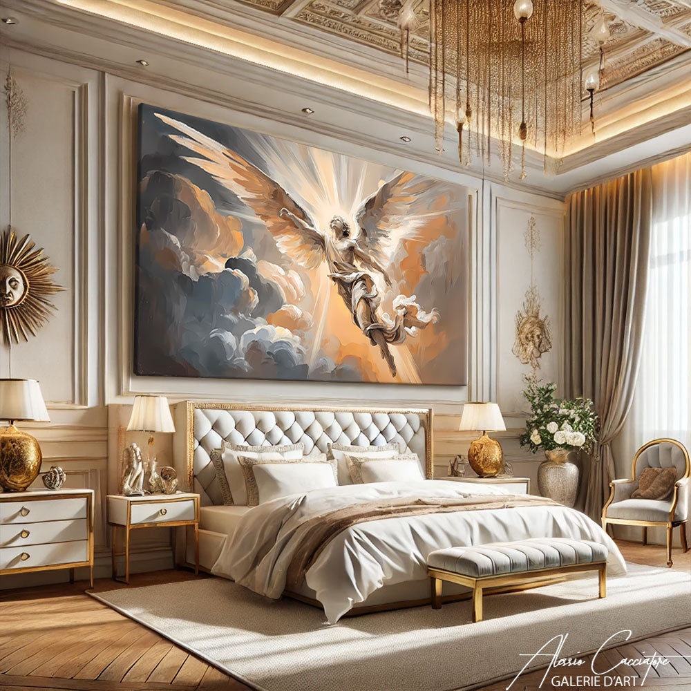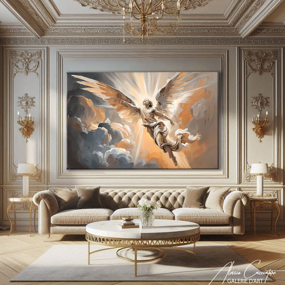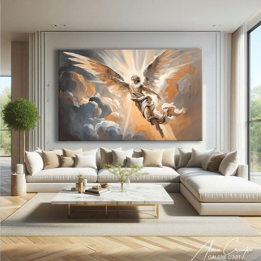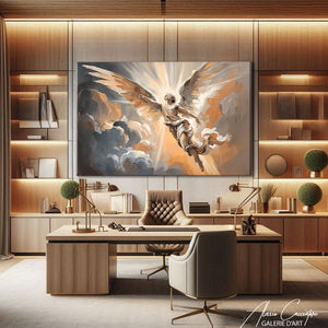 Notre tableau ange présente une silhouette céleste volant vers les cieux dans un style abstrait. Éthéré et lumineux, il incarne paix et élévation. Parfait pour une atmosphère apaisante et raffinée.