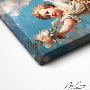 Notre tableau ange Saint Michel illustre un chérubin dans le ciel tenant des fleurs. Céleste et apaisant, il respire paix et légèreté. Parfait pour un intérieur doux et harmonieux.